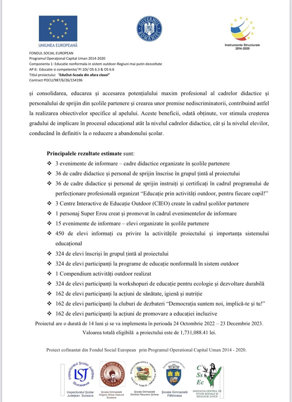 Scoala Gimnaziala Grigore Ghica Voievod-Suceava anunță organizarea selecției pentru constituirea grupului țintă în cadrul proiectului „SPER – Sprijin Personalizat pentru Educația și Reușita copiilor cu CES”, cod MySMIS 341855, pentru anul școlar 2025-2026.