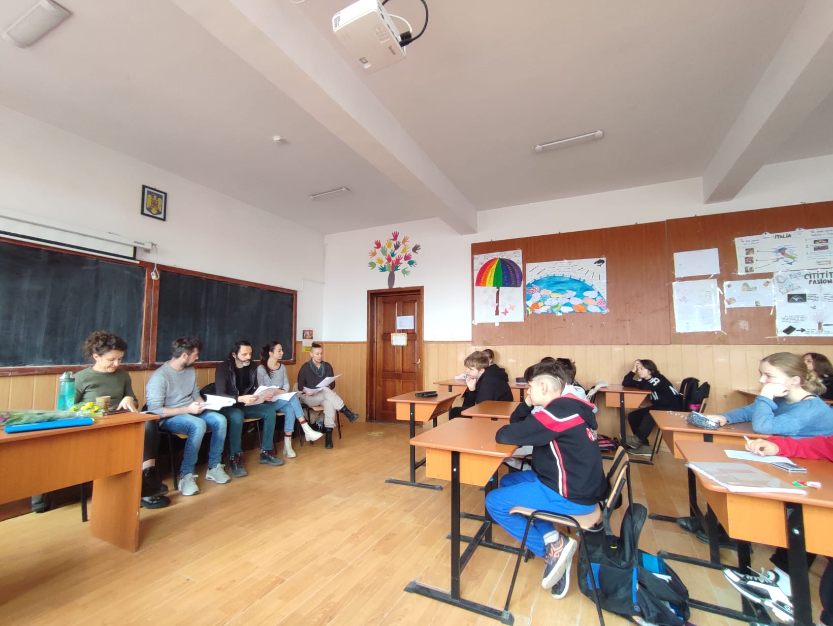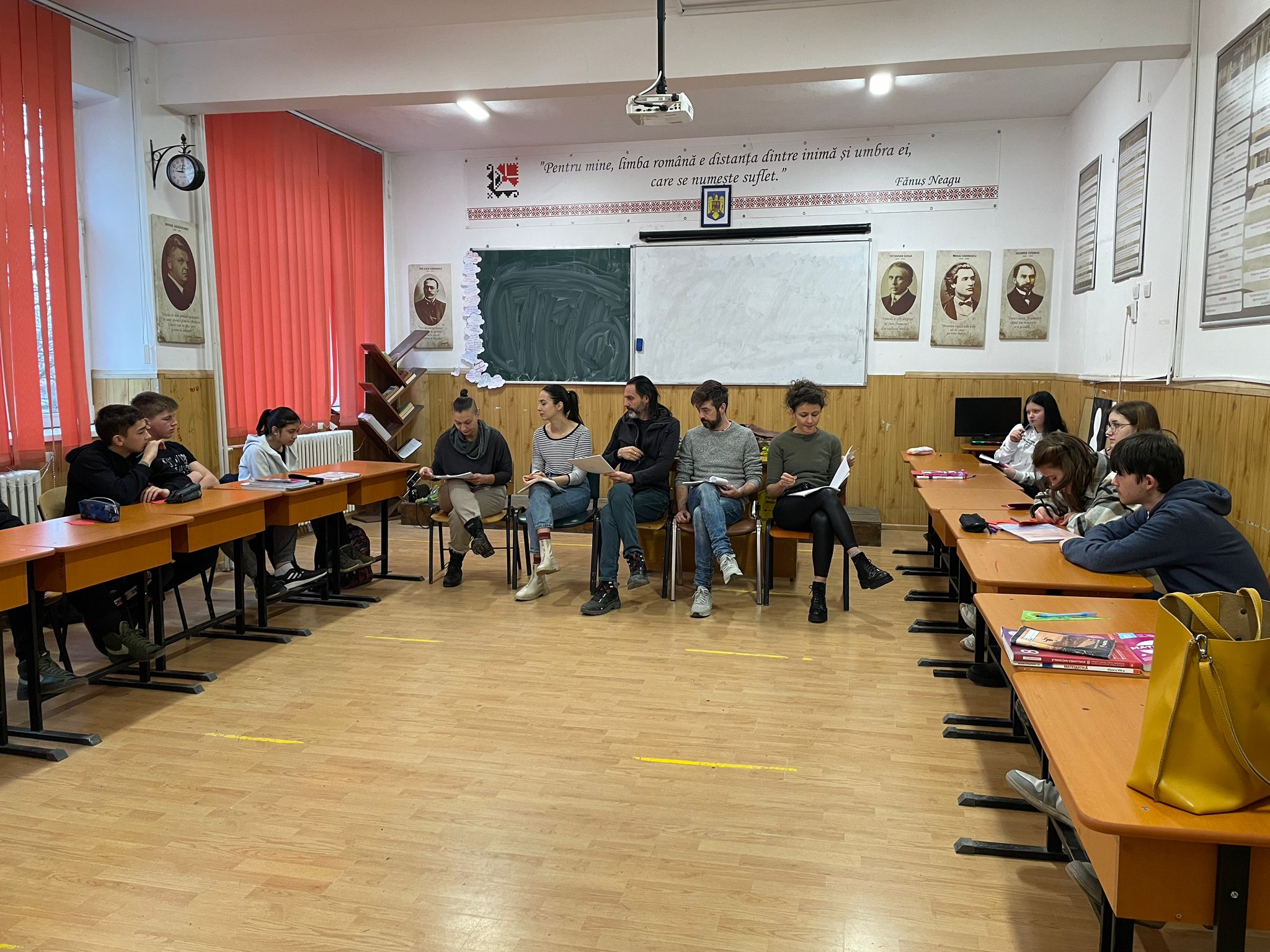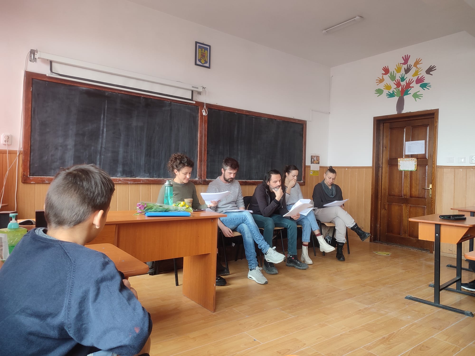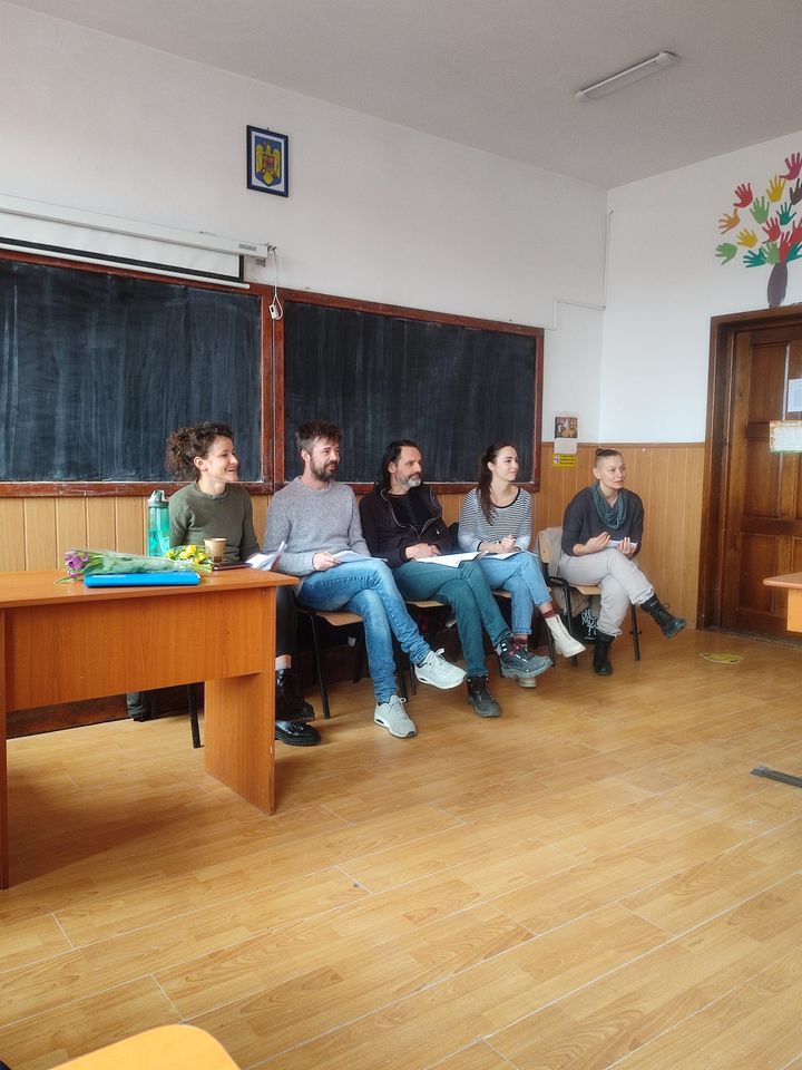 Asociația Un concept LUNA (Luana Popa, Dinel Teodorescu) și actori ai Teatrului Matei Vișniec (Delu Lucaci, Diana Lazăr, Horia Andrei Butnaru), au oferit elevilor noștri, din nou, șansa „de a descoperi importanța și bucuria artelor prin spectacole-lectură”. Textul de astăzi („Pământ!”), scris de Lise Martin, scriitoare, actriță și regizoare franceză, ne-a îndemnat la reflecție. Subiectul, de actualitate, a readus în atenția copiilor dezumanizarea persoanei și întrebarea: de ce ucid oamenii? Răspunsul este inserat discret, la sfârșitul piesei…„Ce se mai poate întâmpla acum?/Ale cui sunt aceste pământuri? Ale cui sunt aceste pământuri?/Suflă vântul discordiei./Nimeni nu-l ascultă pe celălalt. /Nimeni nu ascultă vântul./Al cui e acest pământ./ Al viermilor de pământ poate.” Impactul textului a fost puternic: „piesa mi s-a părut, tristă dar și amuzantă, datorită interpretării, plină de mister și aventură”; „nu m-am gândit că există oameni atât de mincinoși și de nedrepți, precum Ketal, fără strop de milă, zgârcit și nedrept cu lucrurile celorlalți”; „mie mi-au plăcut și actorii foarte mult, deoarece intră în rol foarte bine. Piesa a fost foarte interesantă, ba chiar eu parcă vedeam locul unde se întâmplă acțiunea.” Concluzia: misiunea invitaților noștri a fost încununată de succes, micii iubitori de teatru așteptând cu nerăbdare următoarea vizită.
